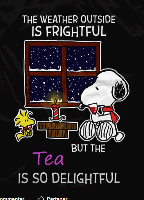 Here in Northeast Ohio, where we live, it’s been snowing something fierce, and the winds have been blowing at over 40 miles per hour. For a while I watched the birds through the frosted dining room window, struggling to cling to the suet feeder, as the wind attempted to blow them off their perilous perch. And as I sat, I was relieved that I had absolutely no reason whatsoever to venture outside. So, most of the day was spent reading, cooking, writing letters and drinking lots and lots of tea. The perfect way to “celebrate” the first snowfall… and I totally agree with Snoopy and his best buddy Woodstock that – “The weather outside is frightful, but the tea is so delightful!”